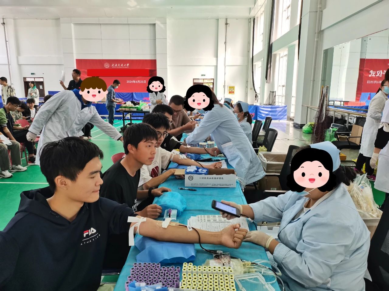 献血现场,医护人员和志愿者忙碌而有序地进行着准备工作,确保每位献血者都能在安全、卫生的环境中完成献血。同学在志愿者的引导下,他们有序地排队,填写献血登记表,进行初步的健康检查。