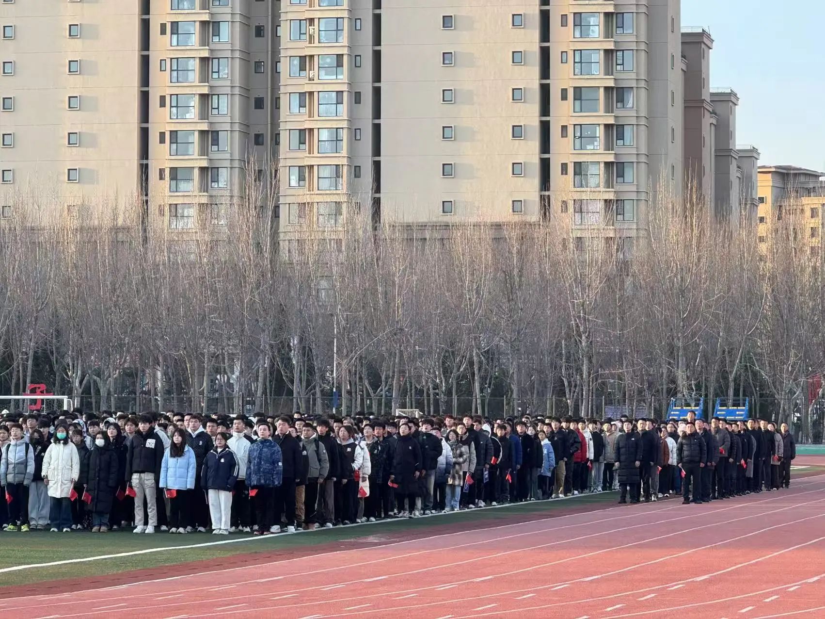 清晨的运动场上,学生们排列成行,面向国旗肃立。随着国歌的响起,鲜艳的五星红旗冉冉升起,学生们神情庄重,心中充满敬意。