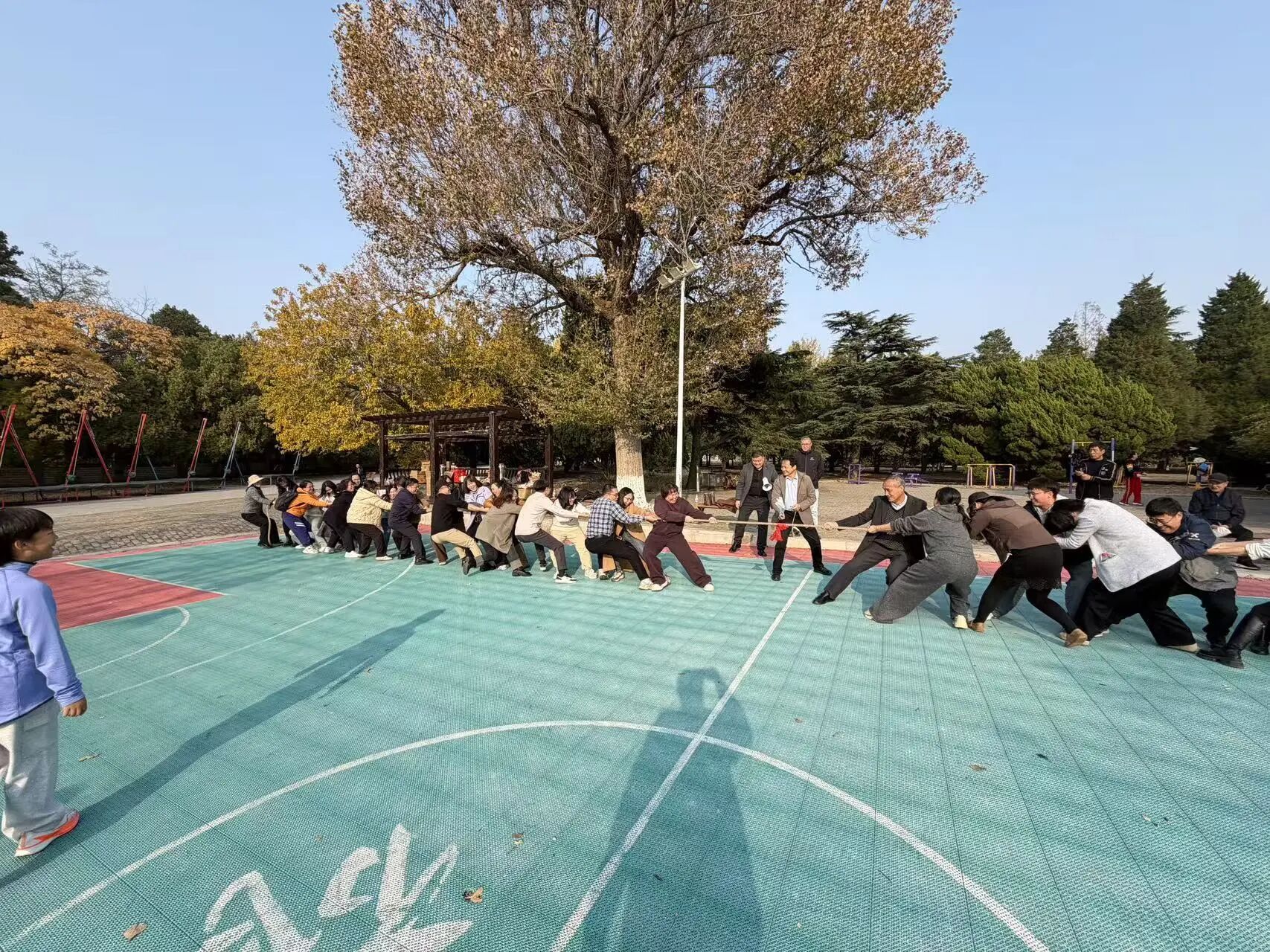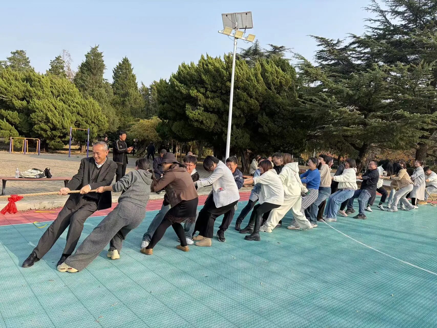 拔河比赛上,参赛教职工齐心协力、呐喊助威,展现出顽强拼搏的团队韧性。