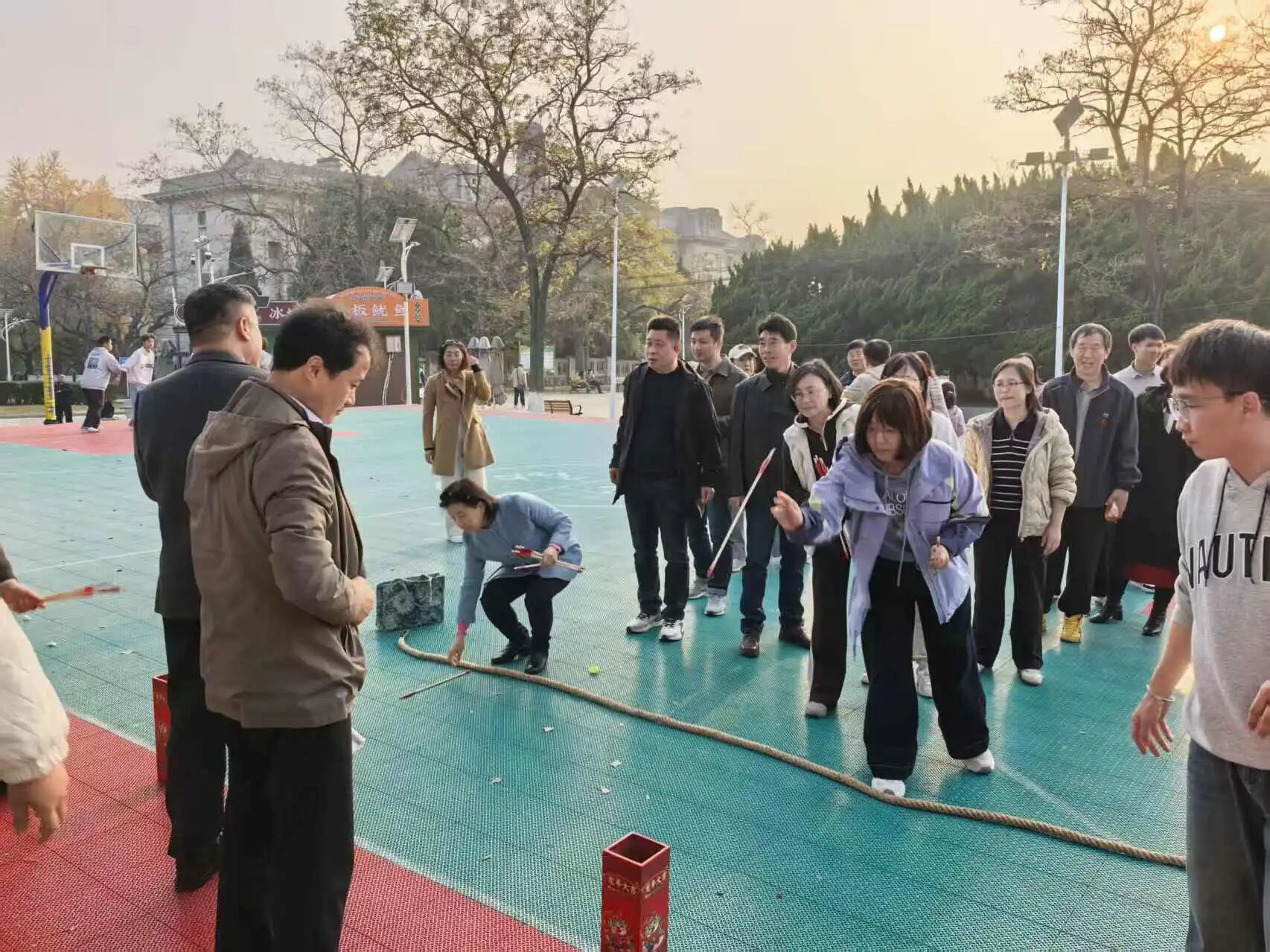 投壶项目里,教职工屏气凝神、精准投掷,感受传统民俗与竞技乐趣。