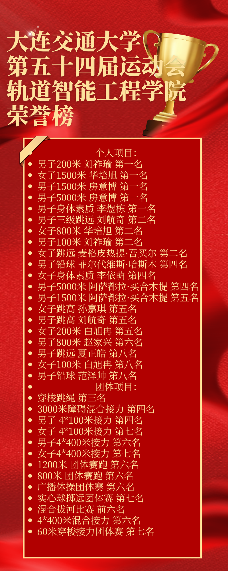 房意博同学于男子5000米项目中勇夺第一名,于男子1500米项目中同样获得第一名;华培旭同学在女子1500米项目中获得第一名,并于女子800米项目中荣获第二名;李煜栋同学在男子身体素质项目中荣获第一名。此外,刘航奇同学在男子三级跳远项目中获得第二名;麦格皮热捉·吾卖尔
