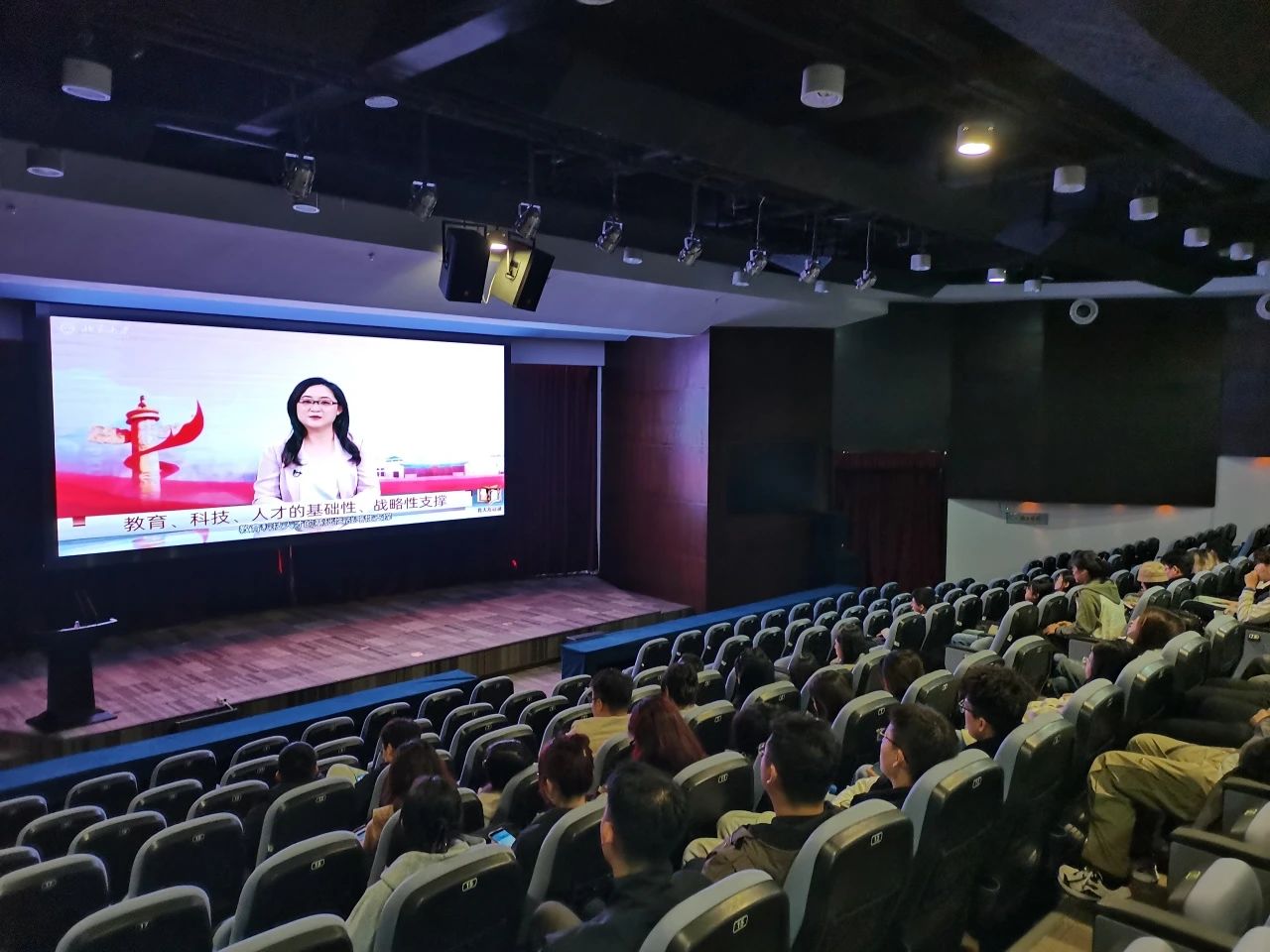 在报告厅中,师生党员们共同观看了《北大学者解读党的二十届三中全会精神系列讲座 第四讲-教育、科技、人才的基础性、战略性》视频及东软集团纪录片。